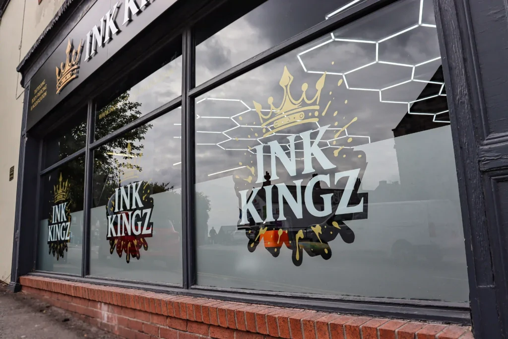 Ink Kingz in Pontefract (www.inkkingztattoostudio.co.uk) were expanding their tattoo studio into the unit next door and needed a full signage and window graphics package to bring the new space to life. Having previously worked with us on their Wakefield studio, they returned to Brand Works to keep their branding consistent across both locations.